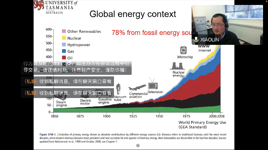 12月6日下午3:00,澳大利亚塔斯马尼亚大学王小林教授应邀参加我校管理学院文科讲坛,于腾讯会议做了题为“澳洲新能源利用现状和发展”的专题讲座。会议由管理学院李澄江副教授主持,管院部分教职工及全体研究生参会。