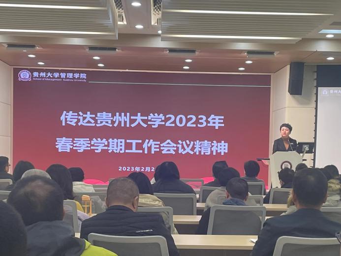 校党委正处级组织员、院党委副书记(主持党委工作)周莉莉传达了贵州大学2023年春季学期工作会议精神。对学校主要领导及相关部门的重要讲话、工作通报进行了传达。她强调,学院上下要把学习好贯彻好党的二十大精神这个首要政治任务和谋划好落实好2023年工作有机结合起来,用党的二十大精神武装头脑、指导实践、推动学院各项工作有序开展,取得成效。她还对近期安全稳定工作会议、2023年全国教育工作会议精神进行了传达。