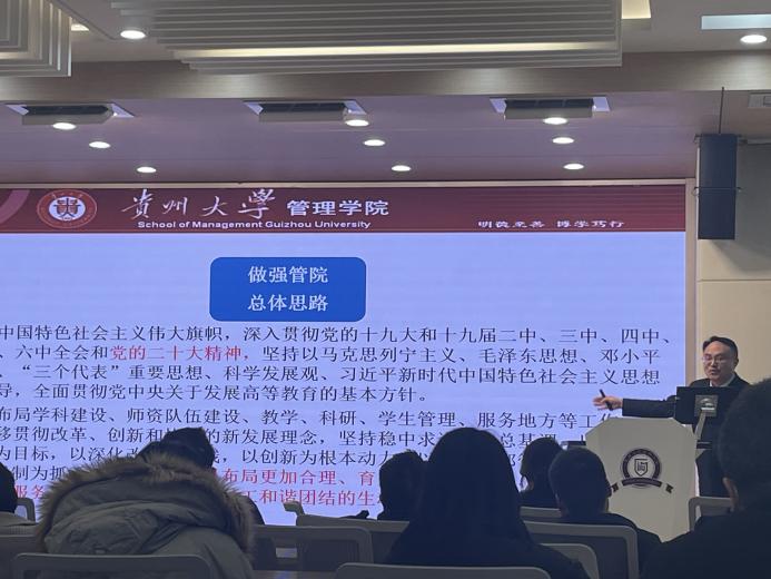 李烨院长作题为“深入学习贯彻党的二十大精神 加快推进学院高质量内涵式发展”的工作汇报,深入分析了教育、科技、人才作为全面建设社会主义现代化国家的基础性、战略性支撑作用。他还对如何提高教育教学质量,发挥学科专业优势,推动“管院+”战略和“数字管院”建设,实现做强管院的战略目标提出了思考,就2023年学院拟推进的9项重点工作作了安排部署。