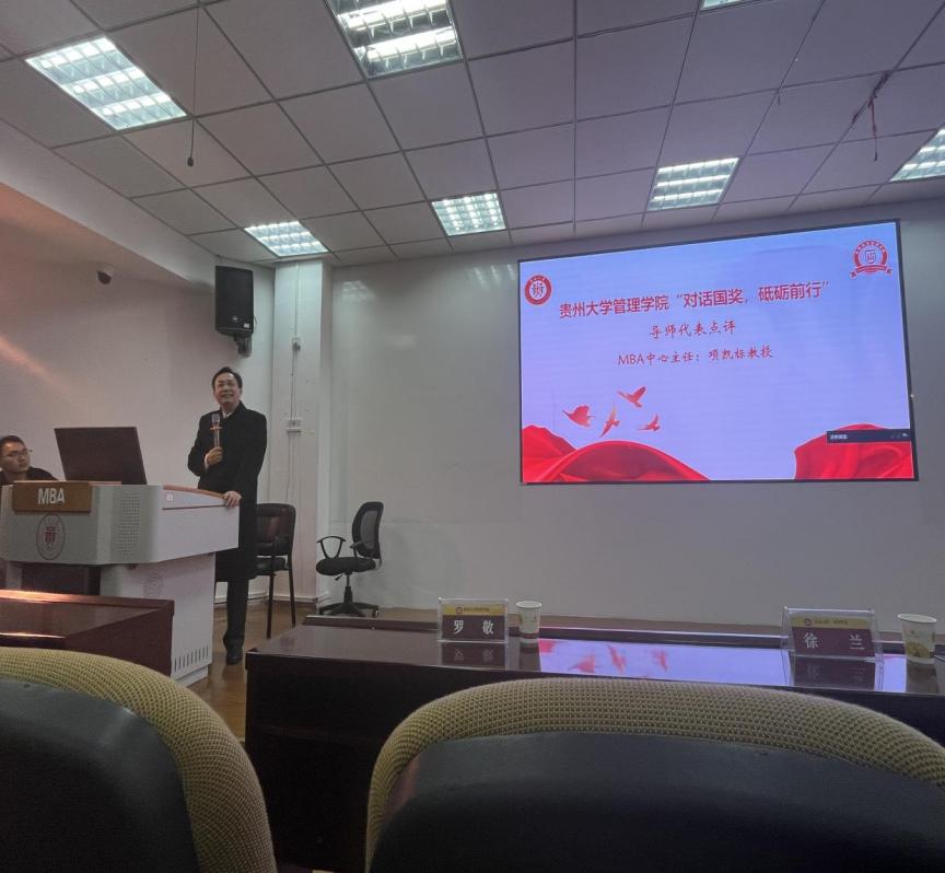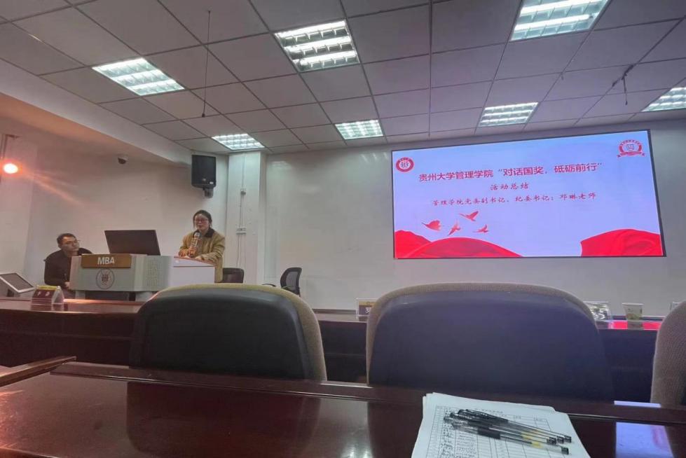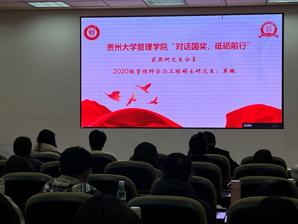 为贯彻落实党的二十大精神,树立先进模范,强化榜样力量,进一步加强校风、学风建设,引领低年级同学做好学业规划,2023年3月6日下午,乐鱼(中国)“对话国奖”主题讲座在东校区慎思楼二楼MBA报告厅举行。管理学院党委副书记、纪委书记邓琳老师出席活动,管理学院MBA中心主任项凯标教授,党政办主任、研究生科科长徐兰老师,研究生科老师,2022-2023学年度研究生国家奖学金获得者莫姝、宋慧琳以及管理学院2021级、2022级全体研究生共同参与活动。本次分享交流会由2022级硕士研究生梁焯然主持。