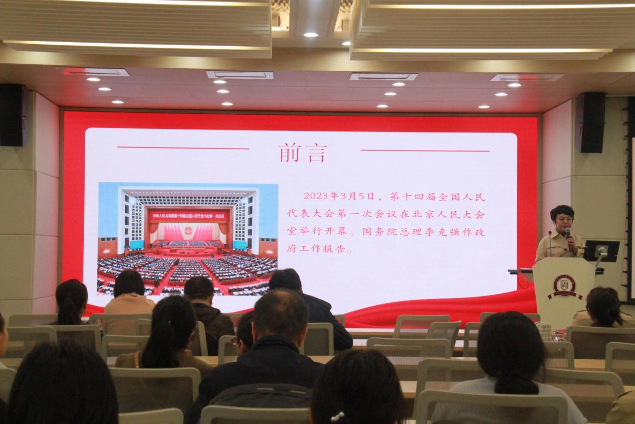 会议的第二阶段,校党委正处级组织员、院党委副书记(主持党委工作)周莉莉教授传达学习2023年全国两会精神,周书记重点围绕“政府工作报告”进行传达学习,指出在以习近平同志为核心的党中央坚强领导下,过去五年党和国家事业取得的历史性成就,并对2023年主要预期目标和重点工作做了介绍。
