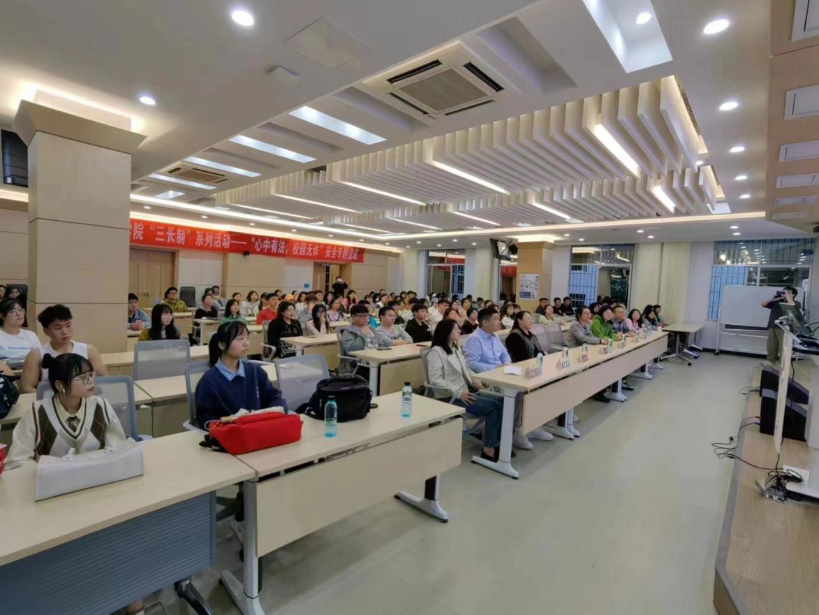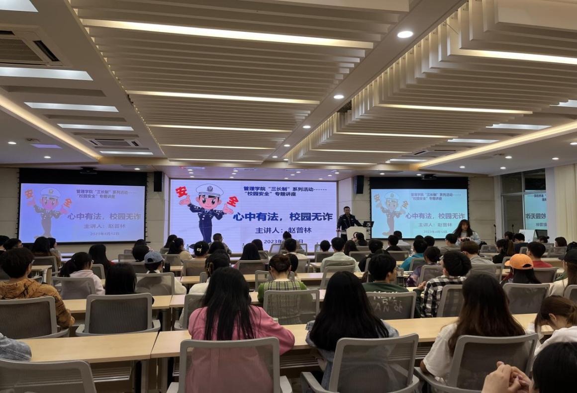 2023年4月12日晚上19:00,在致远楼三楼报告厅举办了管理学院“三长制”系列活动之“校园安全”专题讲座。本次讲座由“新时代公安标兵”松山派出所的赵普林警官主讲,管理学院党委副书记邓琳、学生科科长芮丽华、辅导员龚潇潇、车婧娴、陈黔江、赵一萍出席本次讲座,学院本科生、研究生各班级党员、主要学生干部及寝室长120余人参加此次讲座。本次讲座由管理学院党委副书记邓琳主持。