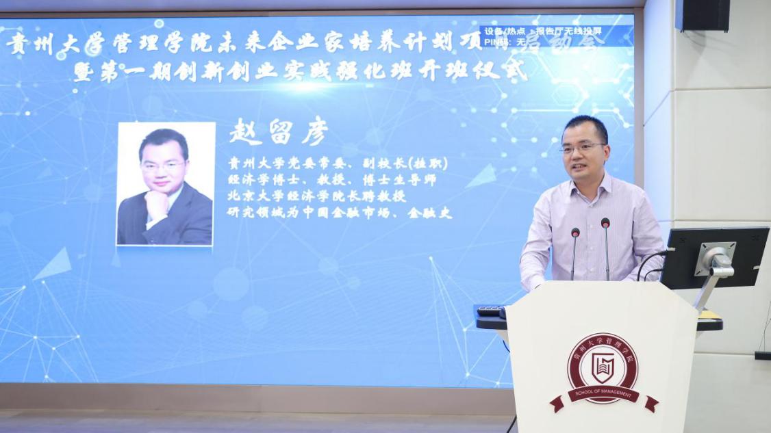 贵州大学副校长赵留彦讲话,对学院实施好未来企业家培养计划作了重要指示,对第一期创新创业强化实践班提出了具体要求。他指出乐鱼(中国)未来企业家培养计划既“仰望星空”,又“脚踏实地”;致力于培养能够促进地方经济社会发展,富有国际视野、战略思维、诚实守信、社会责任感、团队精神和创新创业能力的高素质经营管理人才。要求学员要具有现代管理思想和先进管理理念、熟悉市场经济运行规律;具有强烈的创新创业精神和竞争意识;能够适应市场经济发展需要和熟悉国际化经营规则。