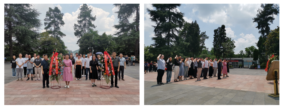 随后,全体党员同志步行来到遵义红军烈士陵园缅怀先烈。遵义红军烈士陵园是爱国主义教育和革命传统教育的重要基地,在红军山烈士陵园前,全体同志队列整齐,瞻仰革命烈士纪念碑。随后,院党委副书记(主持党委工作)周莉莉、院党委副书记邓琳、学院副院长李本光向前献上花篮,随后大家一起向革命先烈三鞠躬。重温我们党波澜壮阔的奋斗历程,全体同志为烈士英灵默哀,表达对革命先烈的深切缅怀。