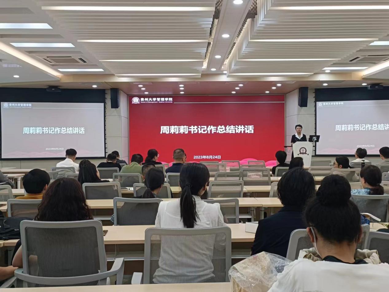 周莉莉书记向大家传达了贵州大学2023年秋季学期工作会议精神,她强调我们要引进高质量人才,做好主题教育后半篇工作。在政治理论学习阶段,周莉莉书记带领大家进一步学习了中华人民共和国教师法、中华人民共和国教育法、贵州省委十三届三次全会精神、贵州大学关于加强新形势下宗教工作的实施意见等内容,她强调我们要不断加强理论学习,加强理论指导实践,不断朝着为管理学院、贵州大学乃至贵州省的高质量发展的目标而努力。