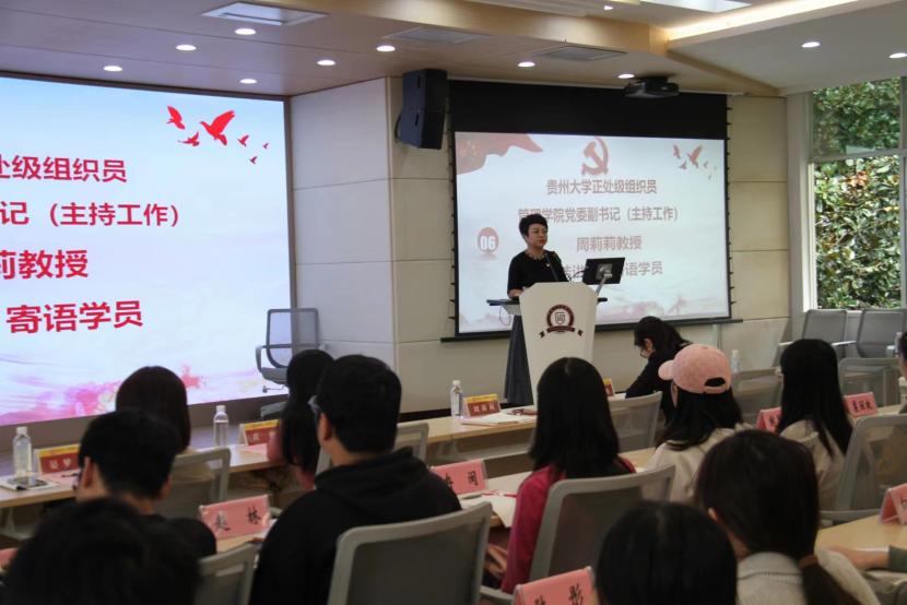典礼第六项,贵州大学党委正处级组织员、管理学院党委副书记(主持党委工作)周莉莉作总结发言,并寄语学员。她希望并要求各位学员务必端正入党动机,在不断的学习中从思想上和行动上提升自己。在此基础上,持续加强个人建设,成为“有理想、有道德、有文化、有纪律”的“四有新人”;其次,本次两个班均邀请了在党建学术和理论方面有深厚造诣的教授和专家进行教学,希望学员们能珍惜这次学习机会,按照各环节的要求认真学习,让思想更趋于成熟;第三方面则要求学员在学习期间严格遵守纪律,按照学习的节奏进行,以共产党员的标准严格要求自己,做好榜样起到带头作用。最后,对广大学员寄予殷切的希望与嘱托,希望学员们在本次学习中都能有所收获。