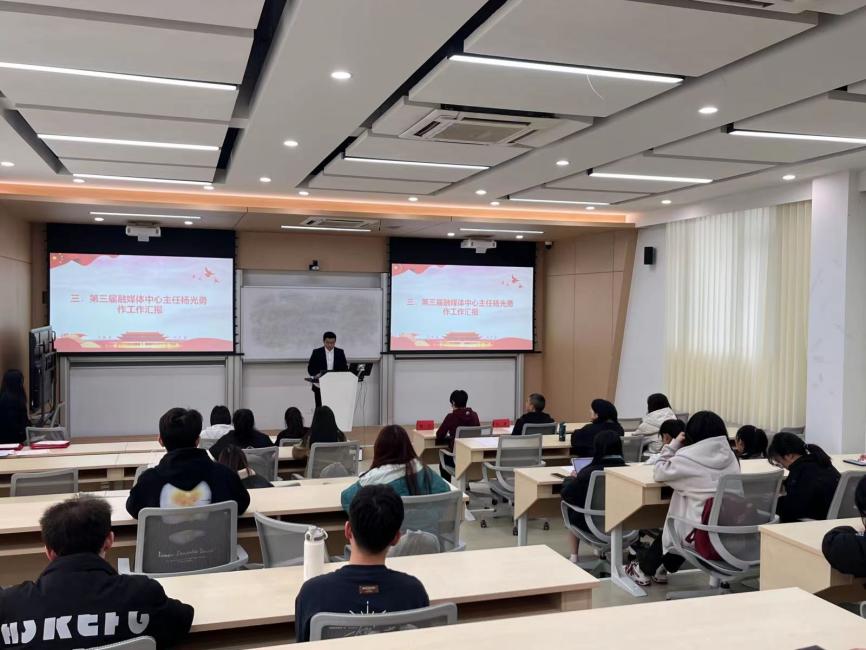 管理学院融媒体中心第三届主任杨光勇作工作汇报,他总结了融媒体中心过去一年的工作成就,分享了对未来的展望,强调融媒体中心全体成员需要把握当下,紧密团结,迎接未来的挑战,并为未来的发展做好准备,将融媒体中心的优良传统发扬光大。