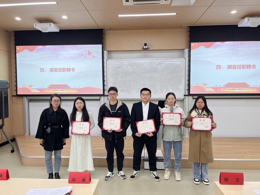 随后,邓琳副书记向融媒体中心第三届学生干部颁发任职聘书并合影留恋;徐兰老师为融媒体中心先进个人颁发荣誉证书并合影留念;主持人宣读融媒体中心第四届学生干部任职名单。
