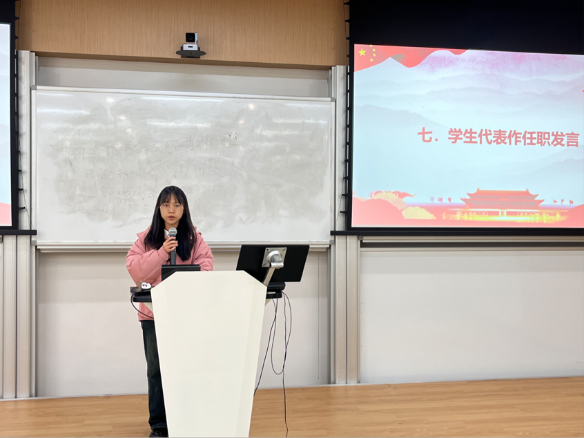 紧接着由学生干部代表杨艳同学作任职发言。她代表新一届融媒体中心全体成员对领导和老师的信任与肯定表示感谢,并表示融媒体中心全体成员将以更高目标、更高标准来激励未来的工作,在学院党委行政的带领下,努力将融媒体中心建设为一支更有影响力、凝聚力、创新力的团队,在新的学年里,共同迈上更高的台阶。