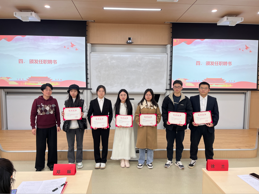 随后,邓琳副书记向融媒体中心第三届学生干部颁发任职聘书并合影留恋;徐兰老师为融媒体中心先进个人颁发荣誉证书并合影留念;主持人宣读融媒体中心第四届学生干部任职名单。