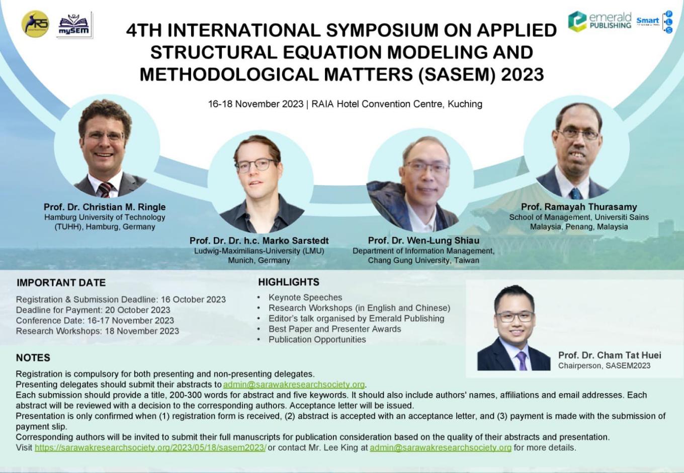 20231116日至18日,乐鱼(中国)汤美润副教授赴马来西亚古晋RAIA酒店会议中心参加了第四届国际应用结构方程模型和方法论研讨会(SASEM 2023)。来自全球的学者和专家聚集一堂,共同探讨定量方法在管理学研究中的进步和应用。会议邀请了多位知名学者进行主题演讲,包括来自德国汉堡工业大学(Hamburg University of Technology)的Christian M. Ringle教授和慕尼黑大学(Ludwig-Maximilians University)Marko Sarstedt教授,以及来自台湾长庚大学(Chang Gung Univerisity)Wen-Lung Shiau教授和马来西亚理科大学(Universiti Sains Malaysia)的Ramayah Thurasamy教授。