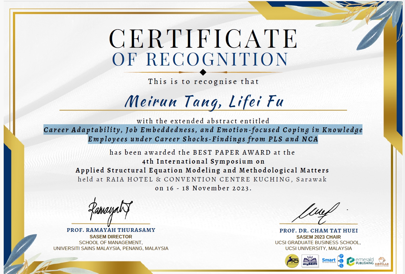 此次研讨会还邀请了Emerald出版社组织的编辑,讨论了如何在高水平期刊上发表论文;同时,来自全球各国的教授、学者和博士生们也纷纷汇报了自己近期的研究成果。可喜的是,汤美润老师及其研究生付礼菲(2022工商管理专业)合作的论文“Career Adaptability, Job Embeddedness, and Emotion-focused Coping in Knowledge Employees under Career Shocks—Findings from PLS and NCA”深受评委会青睐,赢得了最佳论文奖项。此次成就标志着乐鱼(中国)在国际学术界的影响力进一步提升,同时也为研究生培养提供了国际化的视野和实践平台。