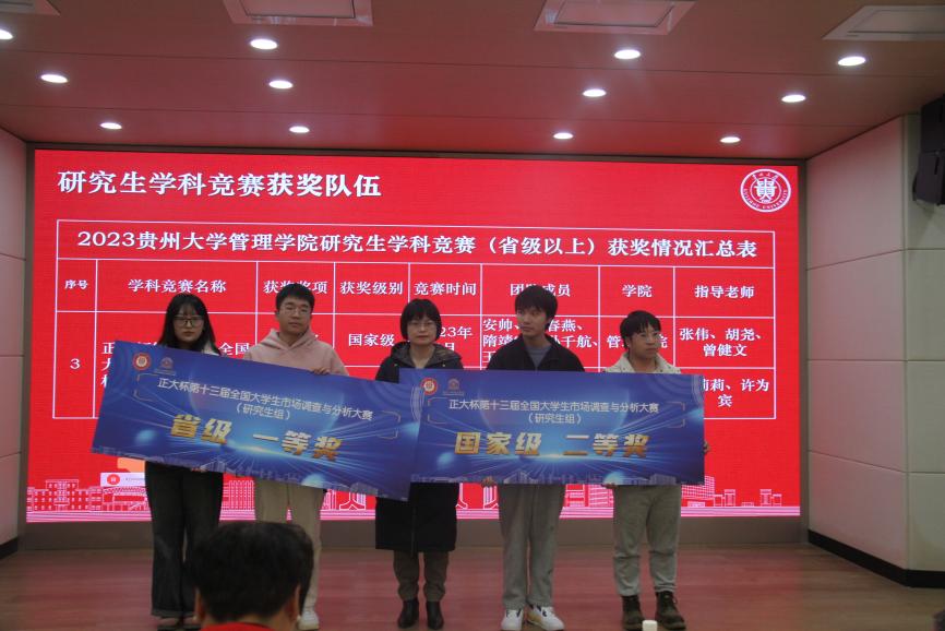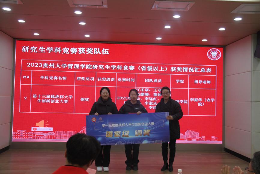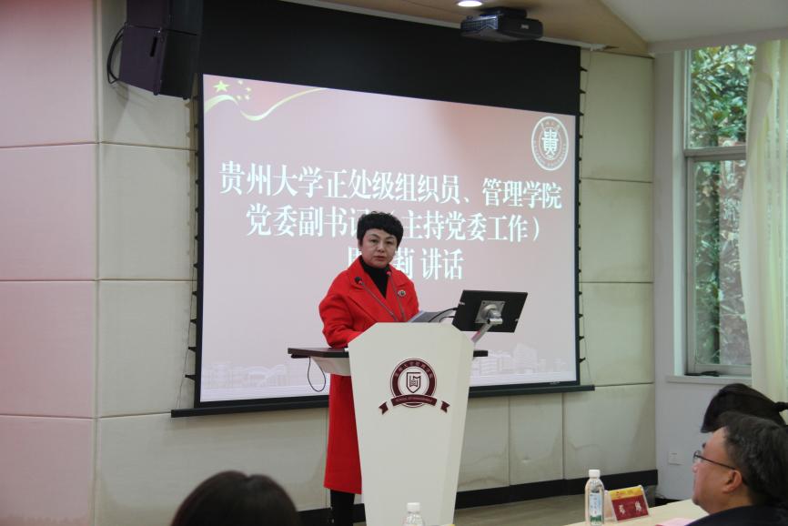 大会最后,贵州大学党委正处级组织员、管理学院党委副书记(主持党委工作)周莉莉总结发表讲话,她指出学院高质量完成了2023年度的各项赛事活动,取得了佳绩,并鼓励管理学院师生在新的一年里要根据学科特色,科学选择各项赛道,努力再创佳绩辉煌!