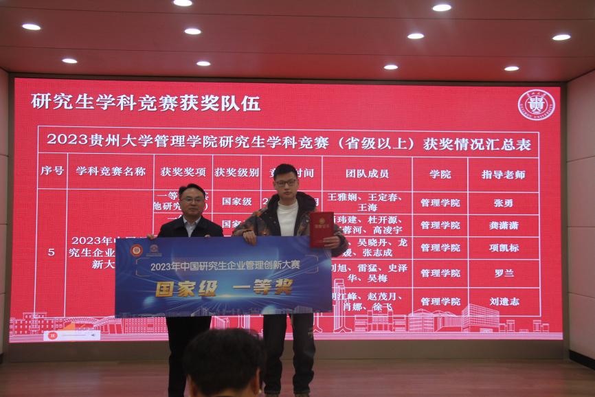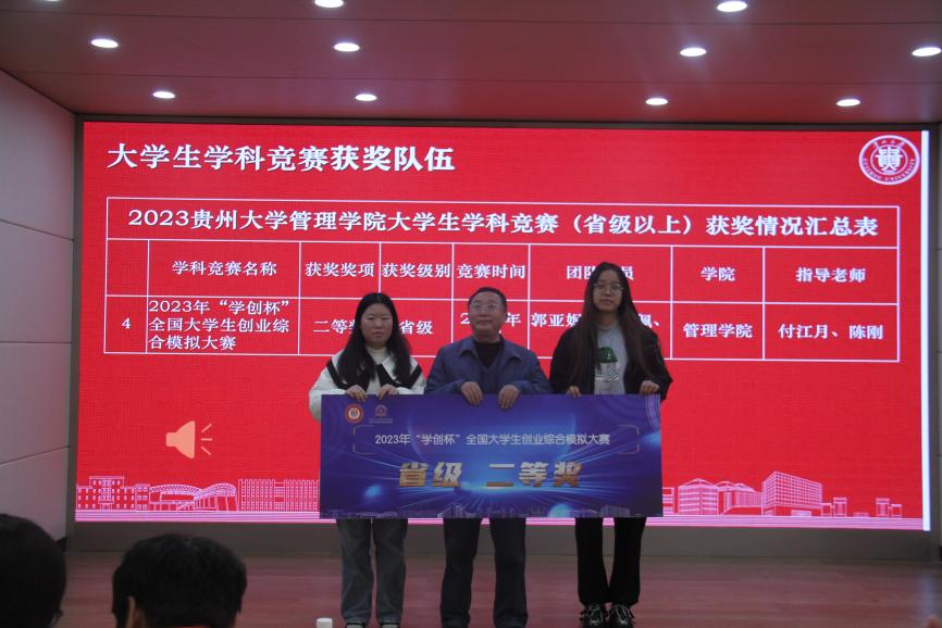 会议第一项会上,贵州大学党委委员、管理学院院长李烨在发表讲话中,指出要贯彻落实习近平总书记关于“加快实现高水平科技自立自强”的讲话精神,响应优化完善创业创新创业布局的战略,贵大学子、管院师生应抓住机遇,积极参与各项大学生学科竞赛。经过学院的宣传动员、管院师生的共同努力,管理学院2023年度在挑战杯、“互联网+”、大学生创业创新大赛、三创赛等各项学科竞赛中硕果累累,取得了优异成绩。李烨院长代表学院党政领导向获奖的团队表示热烈祝贺。