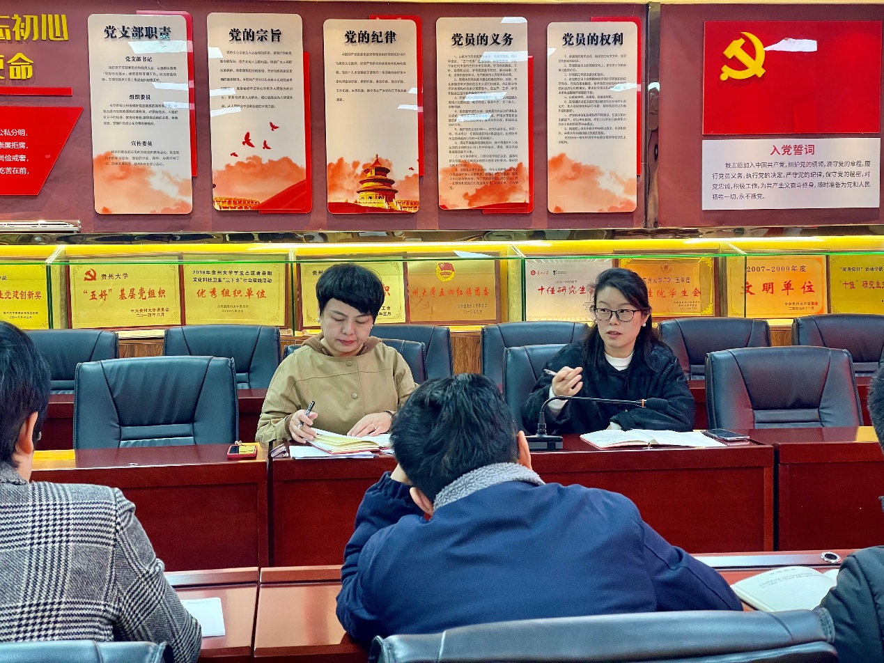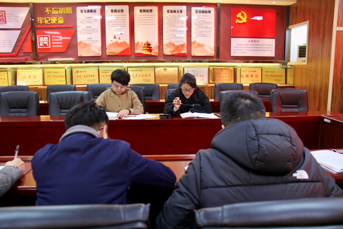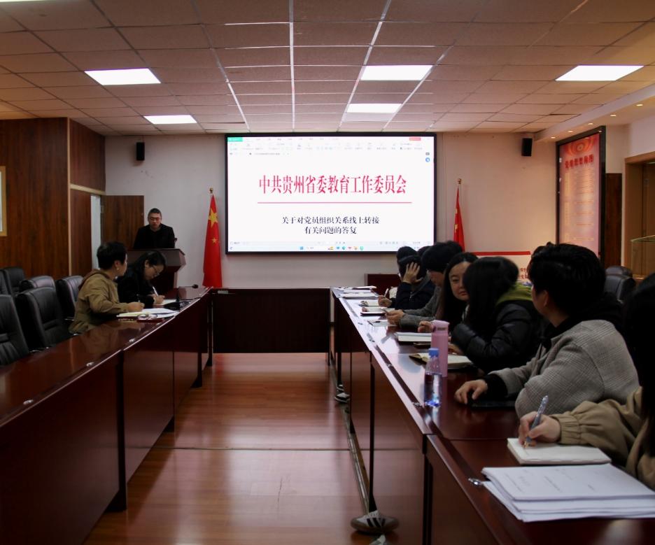 随后,学院党政办主任江波带领大家共同学习了《党支部记录本》的相关内容及要求,主要包括支部记录本的规范性、“三会一课”记录的次数要求等。邓琳副书记补充了校党委组织部对支部记录工作的相关要求,强调了第一议题的重要性,党支部相关信息的更新要与全国党建系统及时同步更新,数据完善和匹配。接着,江波带领大家共同学习了《中共贵州省委教育工作委员会关于党员组织关系线上转接有关问题的答复》,共对九个关系转接问题进行学习和讨论。