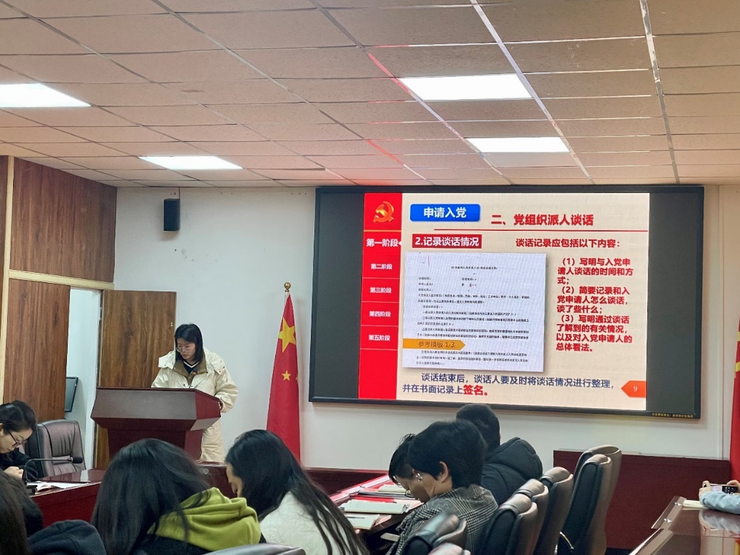 学生科副科长车婧娴老师为大家解读了《贵州省发展党员工作规程(试行)》,主要分为五个阶段和二十五个步骤,并详细介绍了每个阶段相应的流程步骤、具体要求以及注意事项。