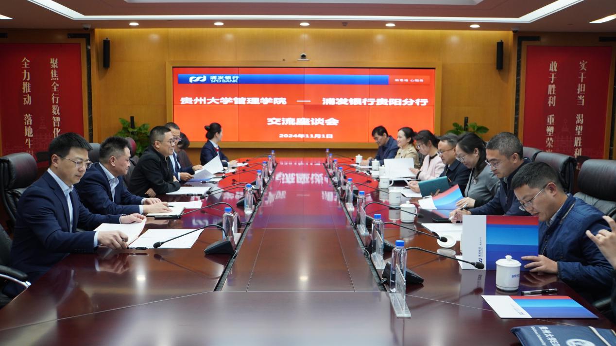 2024年11月1日下午,贵州大学党委委员、管理学院党委副书记、院长李烨,管理学院党委书记王迪,管理学院党委副书记兼纪委书记邓琳等主要领导一行赴浦发银行贵阳分行访企拓岗和交流。