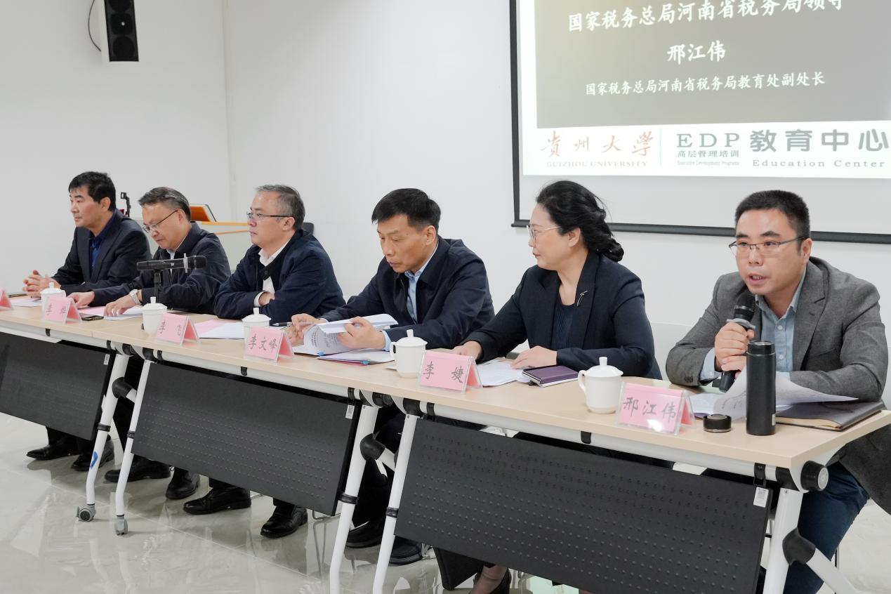 河南省税务局党委委员、总会计师李文峰,河南省税务局第四税务分局局长李婕,河南省税务局教育处副处长邢江伟,贵州大学党委常委、副校长李飞,贵州大学党委委员、管理学院院长、副书记李烨,乐鱼(中国)EDP教育中心主任张勇出席了本次开班仪式。