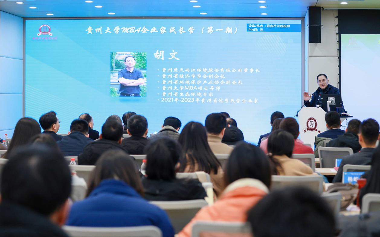 仪式第三项,MBA企业家成长营导师代表贵州楚天两江环境股份有限公司董事长胡文发言,他希望未来学员们将在成长营中收获宝贵的知识与经验,结下深厚的友谊与合作关系,共同成长为具有全球视野、创新精神和社会责任感的卓越企业家,为推动行业进步与贵州的经济发展贡献自己的力量。