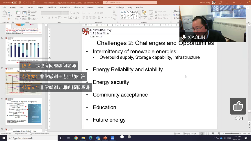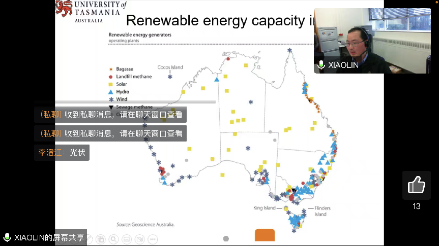 12月6日下午3:00,澳大利亚塔斯马尼亚大学王小林教授应邀参加我校管理学院文科讲坛,于腾讯会议做了题为“澳洲新能源利用现状和发展”的专题讲座。会议由管理学院李澄江副教授主持,管院部分教职工及全体研究生参会。