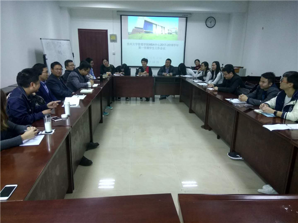 2017年10月20日贵州大学管理学生干部会议在MBA中心202教室成功举行,参加会议的有管理学院副院长周莉莉、MBA中心全体老师以及2016级和2017级MBA学生干部班委。