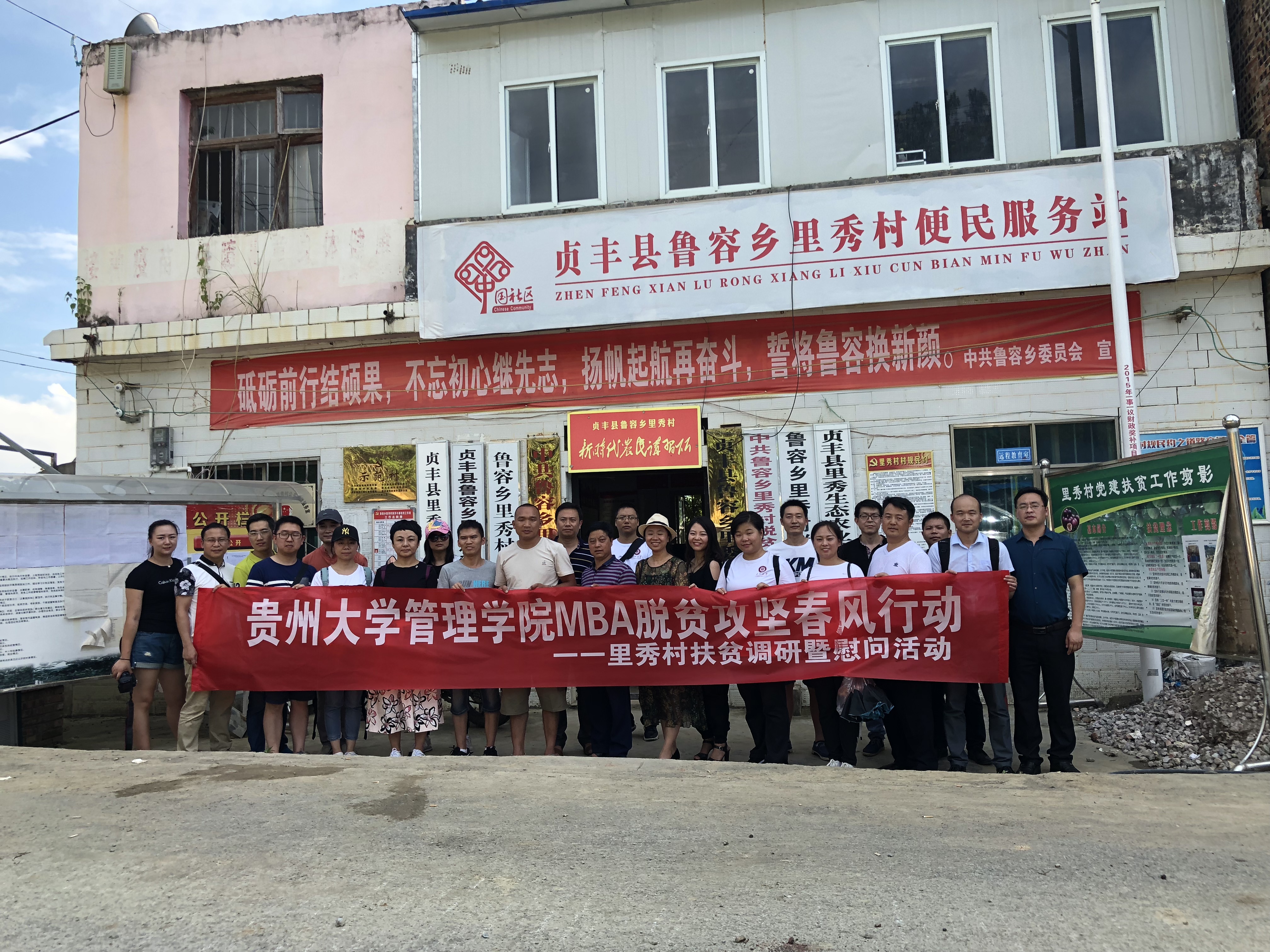 为深入贯彻党的十九大精神,落实《贵州大学脱贫攻坚“春风行动”实施方案》和《贵州大学对口帮扶贞丰县精准扶贫行动实施方案》要求,按照以“发挥教育优势、参与精准扶贫、促进脱贫致富”行动的宗旨,我院积极利用管理学科优势和工商管理人才优势,并积极整合贵州金戈戟科技发展有限公司,共同扎实推进精准扶贫行动,2018年7月20日,乐鱼手机网页版登录入口MBA赴贞丰县鲁容乡开展扶贫调研暨慰问活动。