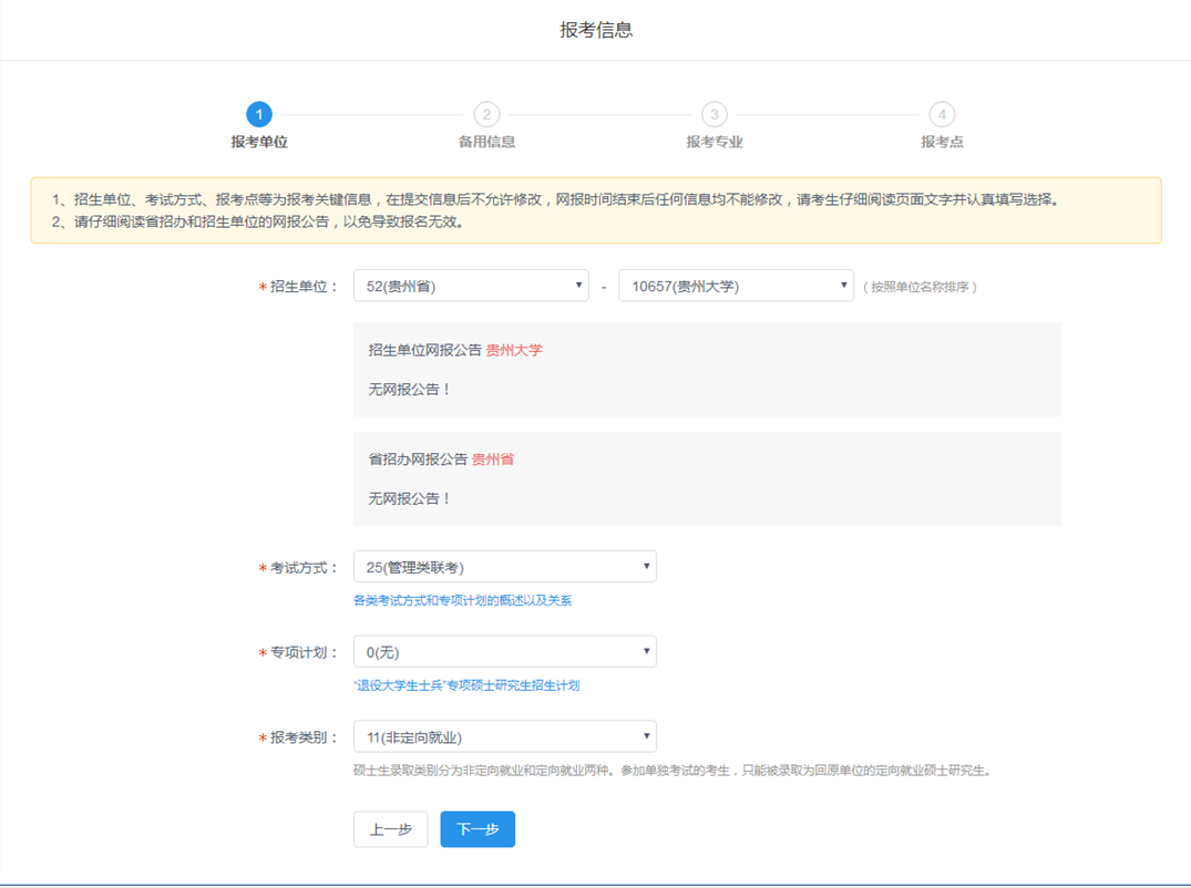 2.请不要开启有网页拦截功能的软件;招生单位、考试方式、报考点等要慎重选择,一旦生成报名号后则不可以修改;如确实需要修改,进入本人报名信息页面点击取消报名,取消已有的报名再添加新的报考信息,已取消的报名信息不可用于现场确认;