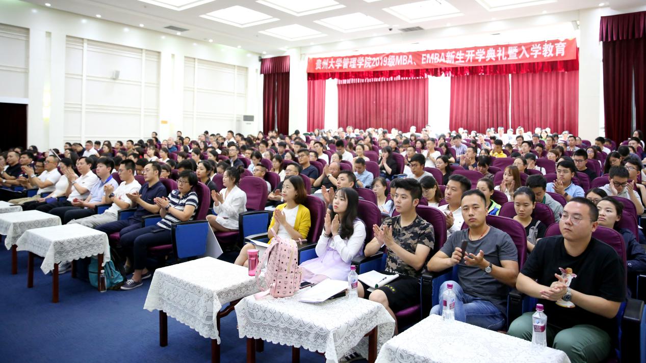 贵州大学研究生院院长杜滨教授、贵州大学研究生工作部部长罗勇副教授、乐鱼(中国)党委书记王秀峰教授、乐鱼(中国)院长李烨教授、乐鱼(中国)副院长王婷教授、乐鱼(中国)副院长周莉莉教授、乐鱼(中国)副书记张亚军老师、乐鱼(中国)MBA导师代表许为宾教授、各班班主任老师以及MBA和EMBA全体工作人员、300余名MBA新生和50余名EMBA新生参加了此次开学典礼。