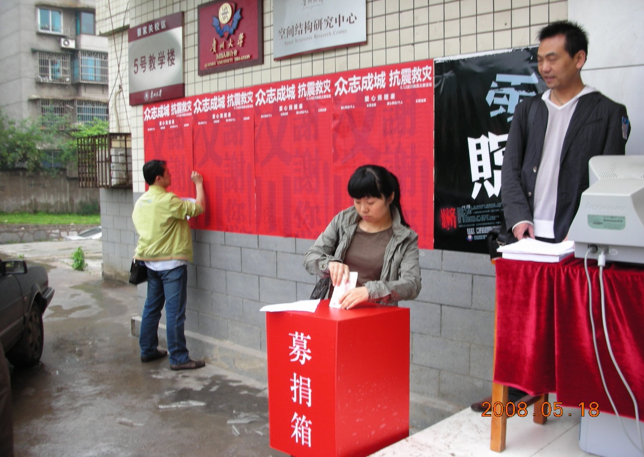 5月18日,贵州大学MBA联合会在蔡家关校区5号教学楼大门口举行了“贵州大学MBA抗震救灾募捐活动”。此次活动共有16个MBA班级参加。活动中,MBA学员纷纷慷慨解囊,为灾区人民献爱心。本次活动所募集的款项将用于救助四川“512地震”中受灾群众。