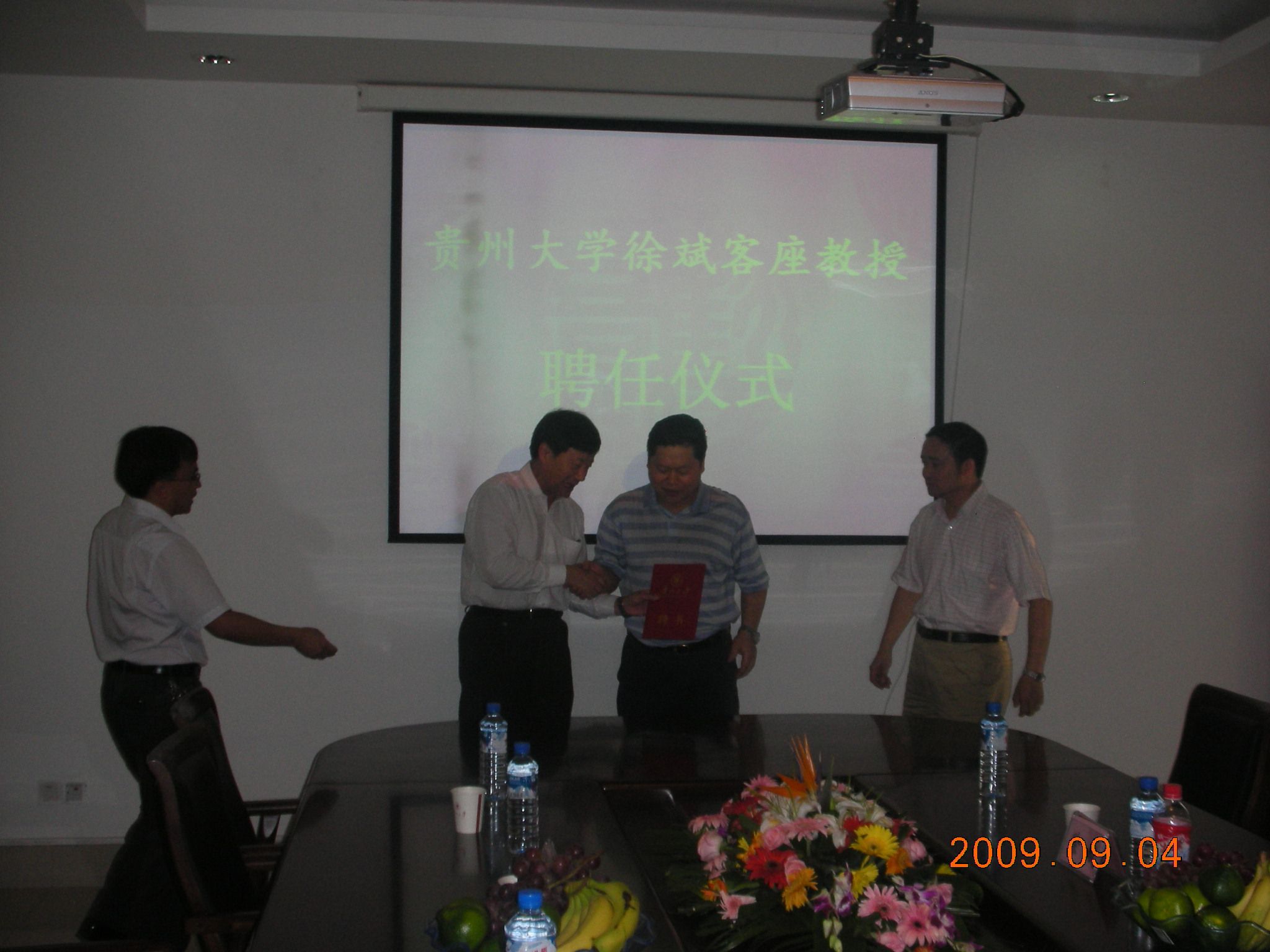 2009年9月4日下午在贵州大学行政楼第二会议室,贵州大学校长陈叔平教授为交通银行贵州省分行行长徐斌颁发了贵州大学客座教授聘书(贵州大学副校长吴次南教授,管理学院院长杜滨教授,MBA教育中心主任李烨博士出席聘任仪式),徐斌正式成为我校客座教授。