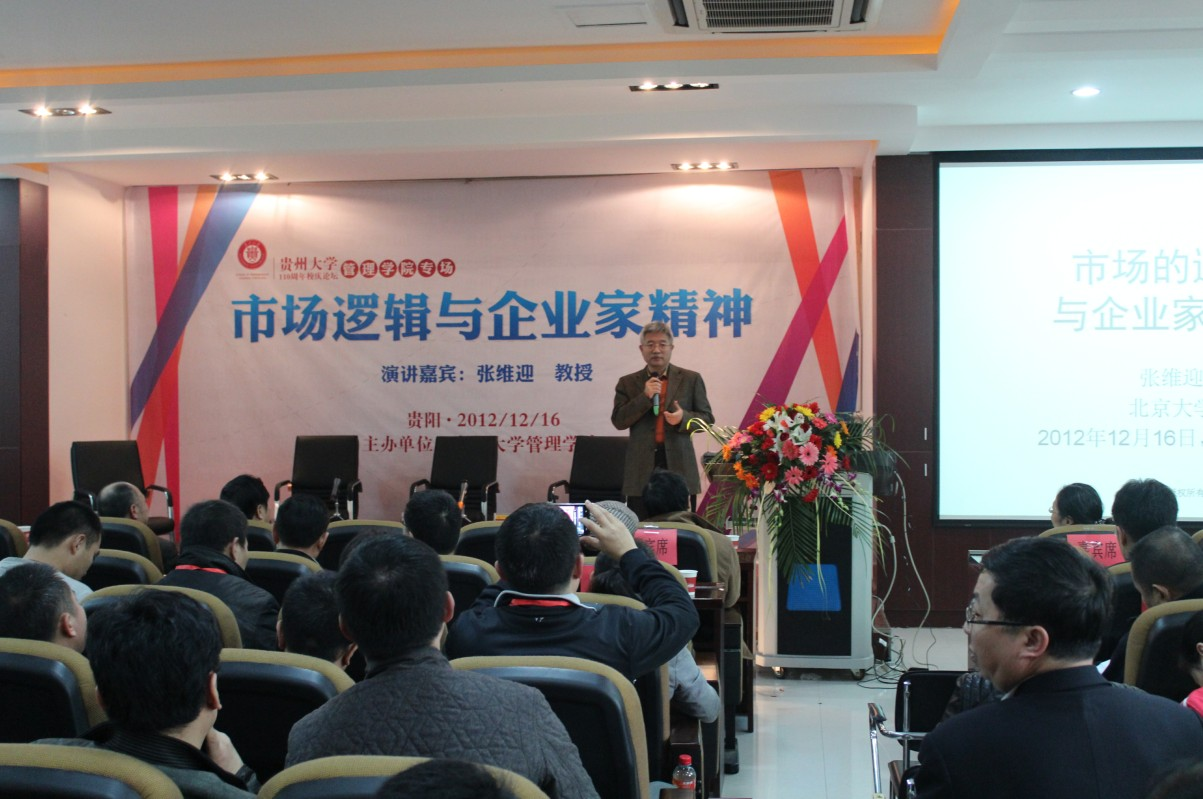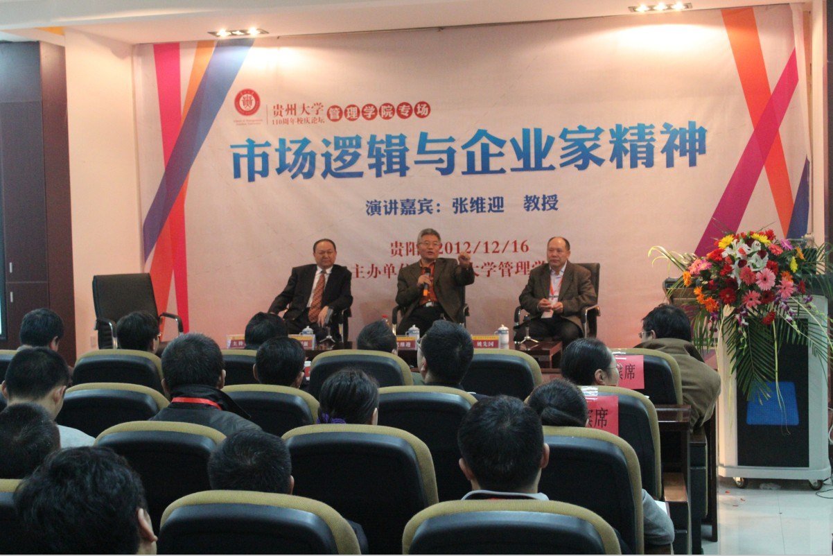 2012年12月16日,在贵州大学110周年诞辰和贵州大学MBA十周年庆典之际,乐鱼(中国)邀请了北京大学光华管理学院经济学教授,北京大学市场网络经济研究中心主任,中国企业家论坛首席经济学家张维迎教授以及贵州省人民政府副省长孙国强,浙江大学公共管理学院院长姚先国成功举办了《市场逻辑与企业家精神》的讲座和《企业家精神与区域经济增长》的论坛。讲座和论坛在乐鱼(中国)3楼报告厅举行,并通过大屏幕现场直播,引来校友和同学们长时间的驻足观赏,成为校庆中一道靓丽的风景线。