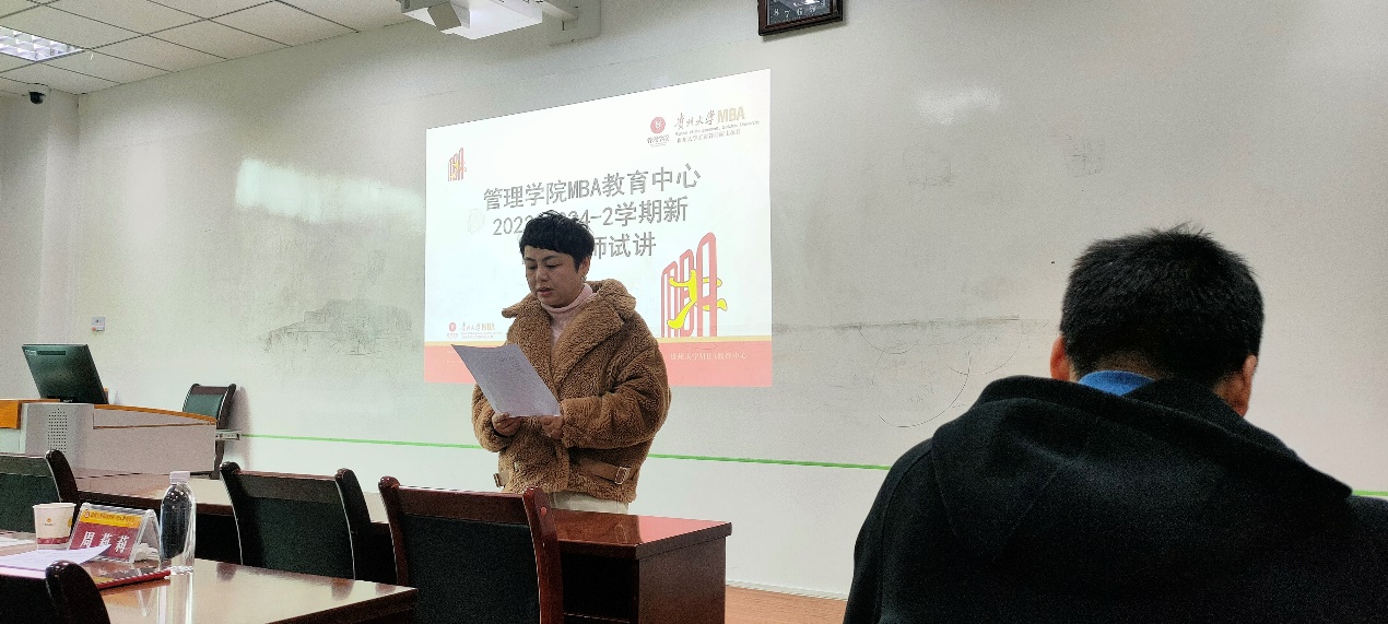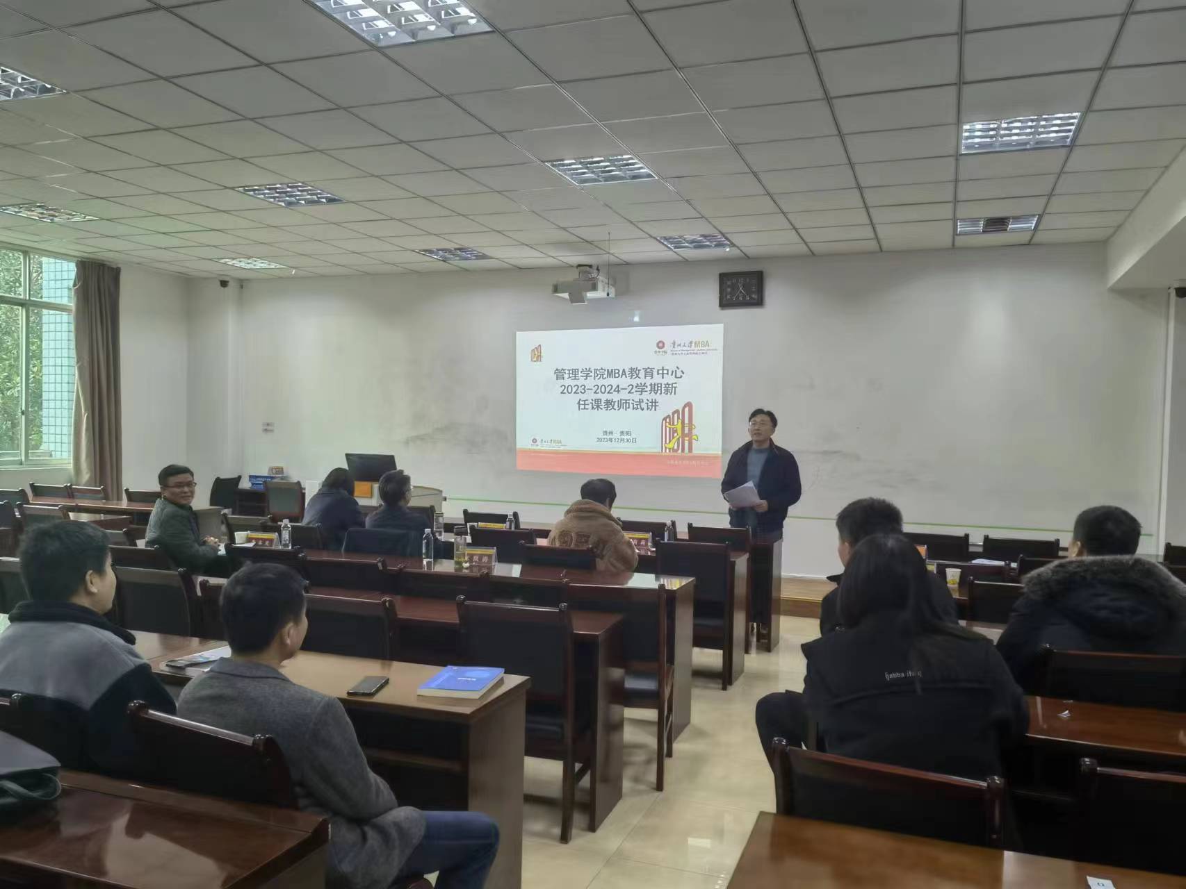 2023年12月30日,乐鱼(中国)MBA教育中心在慎思楼204教室开展2024年春季教师新开课试讲活动。试讲工作由管理学院MBA教育中心副主任何跃勇主持。乐鱼(中国)院长李烨教授,管理学院党委副书记(主持党委工作)周莉莉教授,管理学院副院长(正处级)李本光教授,贵州大学人民武装学院副院长、管理学院副院长(正处级)王婷教授,管理学院林岚涛教授担任评委。