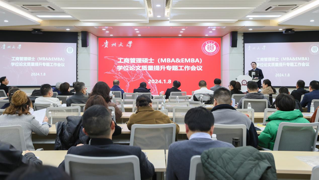 2024年1月8日,工商管理硕士(MBA&EMBA)学位论文质量提升专题工作会议在学院三楼报告厅召开。此次会议由管理学院院长李烨教授主持。贵州大学党委正处级组织员、管理学院党委副书记(主持党委工作)周莉莉教授,管理学院副院长(正处级)李本光教授,贵州大学人民武装学院副院长、管理学院副院长(正处级)王婷教授,MBA&EMBA教育中心主任、副主任,校内外工商管理硕士生导师共60余人参加会议。